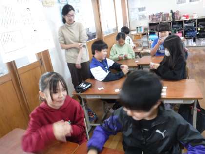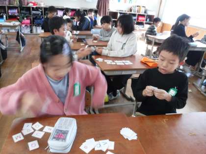 アルファベットを確かめた後は、友達とマッチングゲームをしました。「Do you have a 〜?」と尋ねられると、聞かれた小文字のアルファベットカードを出すゲームです。ゲームを通して、大分覚えてきたようです。