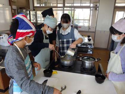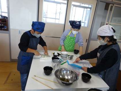 ご飯と味噌汁を作りました。グループで役割分担をして、進めることができていました。味噌汁はこんぶとかつお節でだしをとり、だしを試飲してみると、「おいしい」、「かつお節の味がする」と言っていました。お米も時間や火加減を確認しながら炊くことができました。出来上がりを食べると、「大根がちょっとかたかった」、「おいしい」、「ご飯もやわらかい」など、自分で作ったご飯とみそ汁を味わって食べていました。