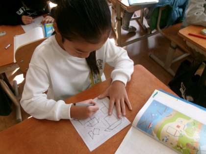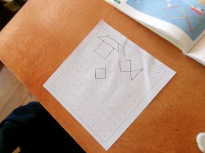 今日は、点と点を線でつなぎ合わせていろいろな形をつくりました。必ず点と点をつなげるように注意しながら、かたちづくりをしていました。魚やロケットのかたちをかいていました。