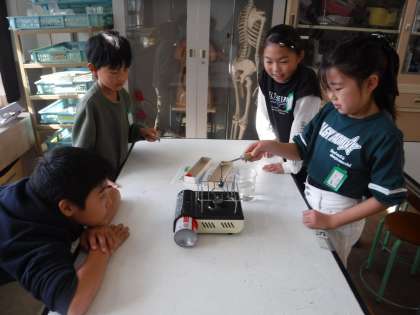 今日は、コンロを使って実験をします。火傷をしないように、みんなで使い方を確かめました。約束を守って、一人一人が気を付けてコンロを扱っていました。