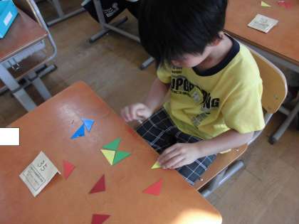 算数のかたちづくりの学習です。今日は、色板をずらしたり、まわしたり、裏返したりして、違う形にするやり方を考えました。