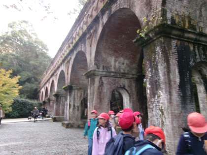 紅葉が美しい南禅寺の中を通り、水路閣を見学しました。レンガ造りのアーチのデザインは4年生から見ても壮観で「うわあ」と声が上がっていました。