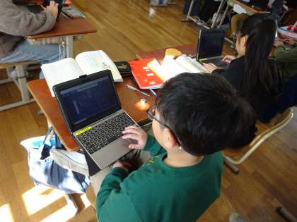 意見文を書くために、自分の考えをタブレットに打ち込んでいます。たくさん考えを出した後、どの考えを使って文章にまとめるかを整理していきます。