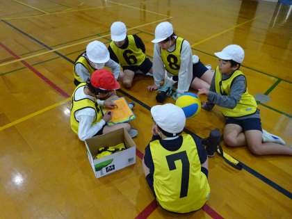 バスケットボールでは、対抗戦をしています。相手チームの特徴を知り、相手に合わせた作戦をたてています。2試合目をすると、勝敗が変わったり、得点差が縮まったりして、白熱した試合になっています。