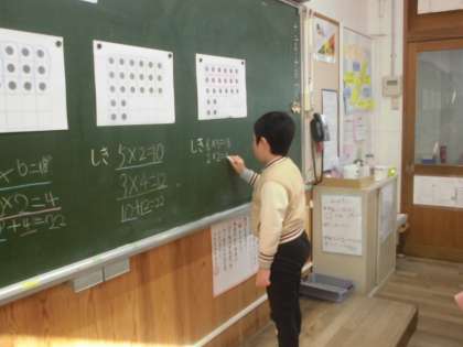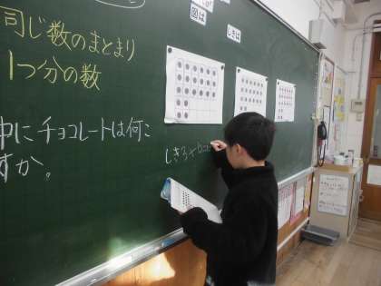算数科の学習で、箱に入ったチョコレートの数をかけ算を使って求めました。