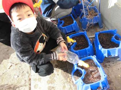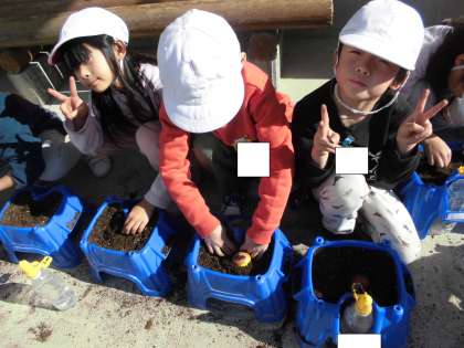 「あさがおの種とちがって大きいね」「玉ねぎみたい」と言いながらうれしそうに植えていました。
