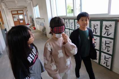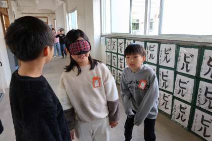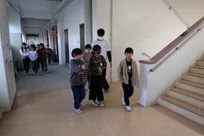 子どもたちは、目に障害のある方の気持ちを考えながら、班ごとに校内を歩きました。