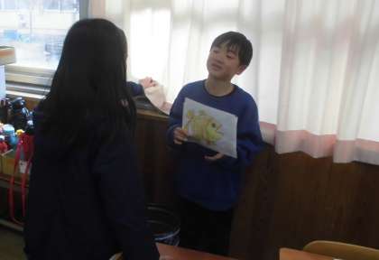 英語活動の時間に、班で作ったオリジナルの絵本の読み聞かせの練習をしました。