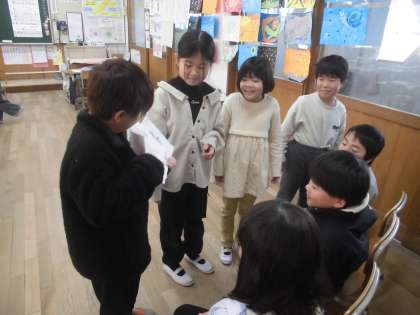 英語活動の時間に、自分たちでつくったオリジナルの絵本を班で紹介し合いました。