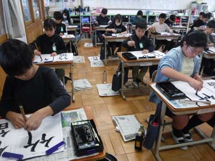 左のはらいに気を付けながら、「竹笛」を書きました。どんどん画数が多くなってきたので、字がつぶれないように筆の運びに気を付けながら書いていました。