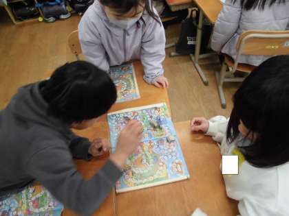 算数で、これまで学んできた大きい数を使って、すごろくをしました。