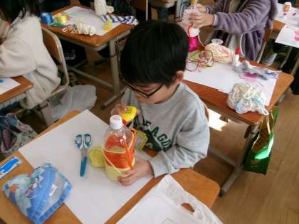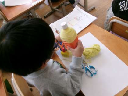 イメージスケッチをもとに、ペットボトルに毛糸やリボンを巻き付けました。