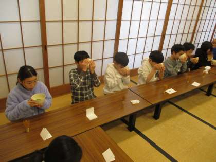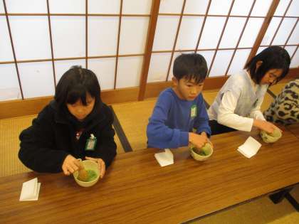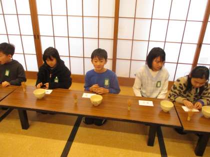 いよいよお茶をたててみました。まろやかな味になるよう、丁寧に茶筌でたてていました。上手にたてられていました。和室にとてもよいお抹茶の香りが広がっていました。