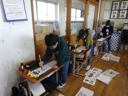 画仙紙に「世界の国」と書きました。普段使っている大きさの半紙とは違ったため、バランスを考えて書くのが難しい様子でしたが、一生懸命取り組んでいました。