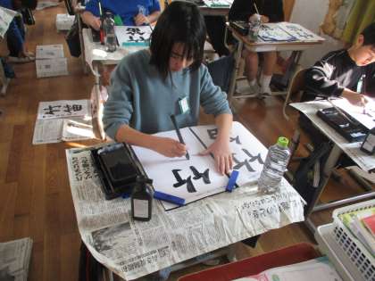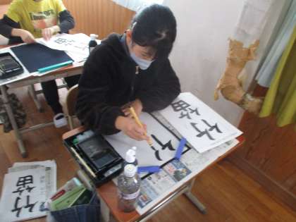 今日の書写の学習では、毛筆で「竹笛」と書きました。上の部分と下の部分の文字の組み立てに気を付けて丁寧に書きました。
