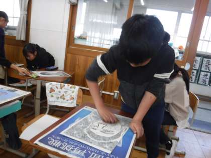 いよいよ版画を摺りました。版画インクを端までしっかり付け、ていねいにバレンでこすっていました。きれいに摺れているか、ドキドキしながら、そうっと版画紙をめくっていあした。頑張った甲斐があり、とってもきれいな版画が出来上がりました。