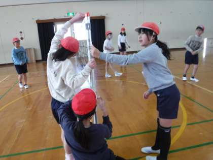 ソフトバレーボールの準備や片付けにも慣れてきました。チームで協力し合って、ネットの張り方も上手になってきました。