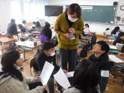 1組で食の指導がありました。朝からおなかが痛くて、元気が出ないまあこさんの生活を振り返り、元気いっぱいの一日にするために、どうしたらよいかを考えました。「朝ごはんに、野菜を取ったほうがいいよ。」「ゲームをする時間を決めて、寝る1時間前にはやめると,早起きできるよ。」と、的確なアドバイスをしていました。その後は、自分達の生活も振り返り、元気に過ごすための目標をたてていました。