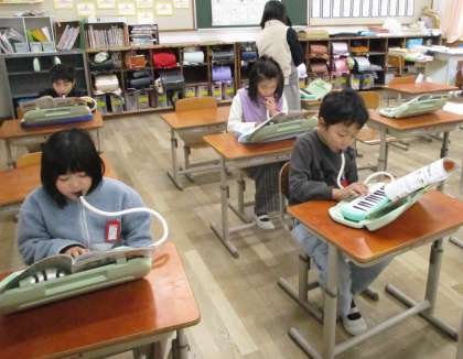 音楽科の学習で、ミ、ソ、ラの3つの音を使って、旋律を作りました。