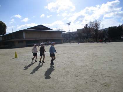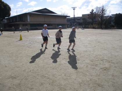 体育科の「ゆっくりペース走」の学習では、グループでペースを合わせて走ったり、自分のペースで走ったりしています。寒い中でしたが、頑張って走っています。