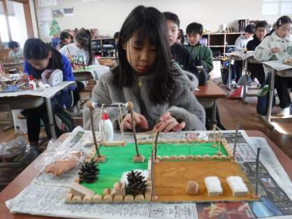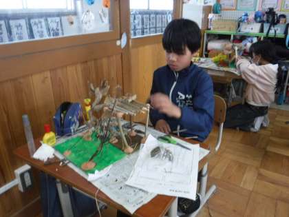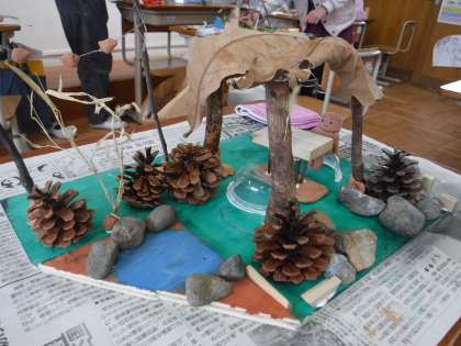 自然のものを使って「ひみつのすみか」を作っています。木々を上手に組み合わせたり、木くず粘土を使って動物などを作ったりし、みんなのアイディアがいっぱいです。そろそろ完成間近です。
