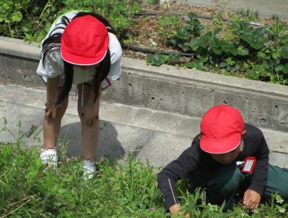 理科の学習で学校にはどんな生き物がいるのか探しに行きました。草むらの下に小さい虫がいたり、チョウチョが飛んでいたり、たくさん見つけることができました。