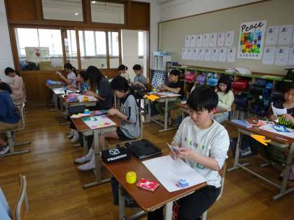 自分の気持ちを表した画用紙を組み合わせて、1つの心を表す作品を作りました。重ね合わせたり、好きな形に切ったり、パスやコンテでかき足したりして、それぞれが楽しみながら作品を仕上げていました。