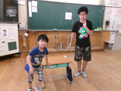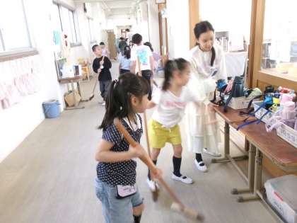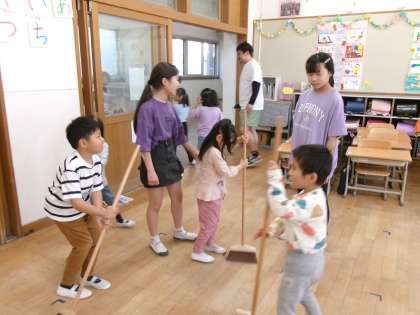 6年生に教えてもらいながら、掃除を頑張っています。ほうきの使い方や床拭きの仕方など、少しずつ上手になっています。掃除が終わった後、「ピカピカ〜!」と喜んでいました。