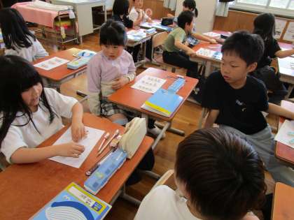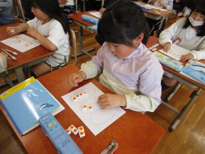 参観で、算数科「わり算」の学習を行いました。いちごの数を同じ数ずつ分ける方法を数図ブロックで確かめました。