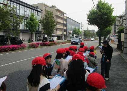 社会科「わたしたちのまち」の学習で、1回目の校区探検に行きました。地図記号をもとに建物や公道の様子を確かめました。