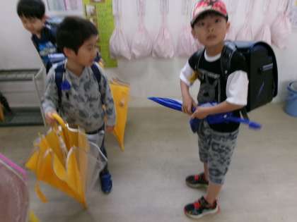 今日は、朝から大雨でした。登校してくると、さしてきた傘を上手にくるくるっと巻いて自分の場所に入れていました。さすが!1年生!!