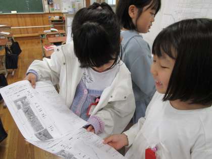 国語科「春風をたどって」の学習で、主人公の気持ちの変化を感情曲線を使って考えました。お友だちの書いた感情曲線と比べて、どうしてそう考えたのかなどたくさん交流しました。