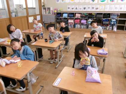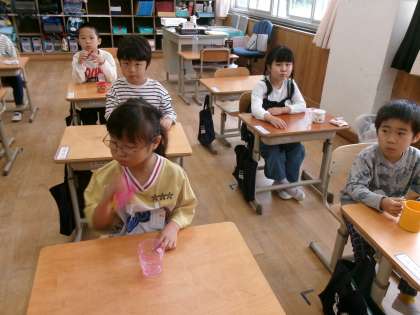 今日から毎週水曜日に、フッ化物洗口を行います。1年生は、フッ化物洗口が初めてなので、どのようにするのかや約束を確かめました。その後、水でぶくぶくうがいの練習をしました。とても上手でした!
