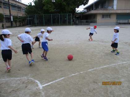 ころがしドッジボールがどんどん上手になってきました。今日は、コートの形を変えてやりました。