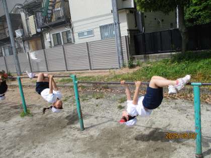 鉄棒と遊具遊びでも新しい技にどんどん挑戦しています。