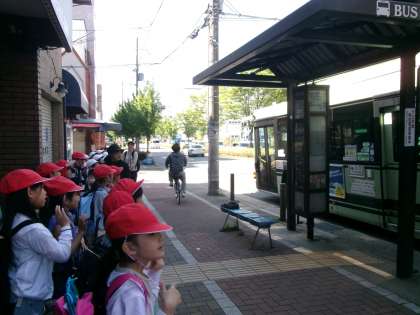 203や205などいろんなバスが通りましたが、京都駅に向かうには行き先に京都駅と書いてあるものに乗らないといけないね、早くバスに乗りたいななどいろんな声が聞こえていました。