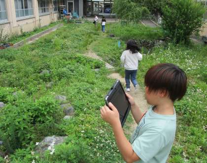 学校にいる生き物を探しに行きました。モンシロチョウやアゲハチョウを見つけました。