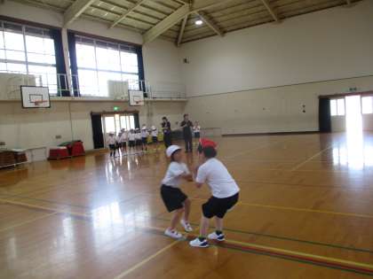 体育館に引いてある線を使って「どん じゃんけんほい」をして盛り上がりました。