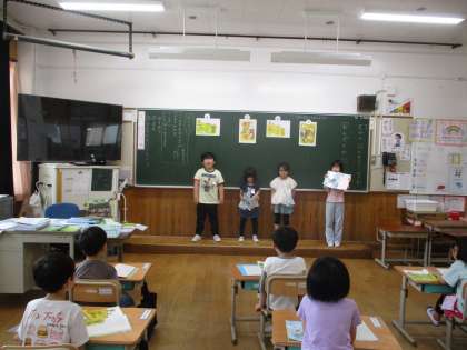 声の大きさや口の形、言葉のまとまりに気を付け、動物たちのせりふをつけたしながら読んでいました。初めての音読会で少し緊張もありましたが、みんな一生懸命にできていました。