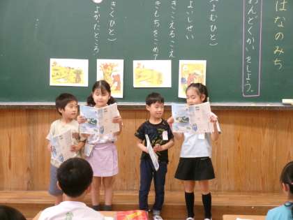 「はなのみち」の音読発表会の様子です。声の大きさや口の開け方、そして読む姿勢など気を付けて音読をしました。友達の良い所もしっかり見つけて、伝えることができました。