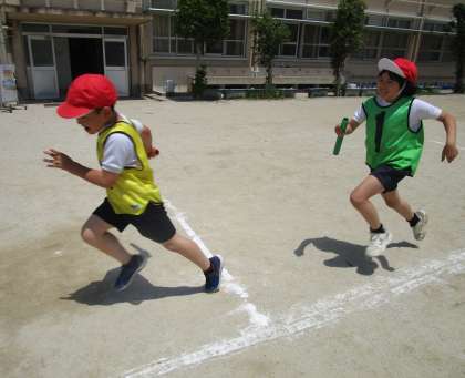 リレーの学習が始まりました。3年生になって、グラウンドを周回するコースに変わり、バトンパスも頑張って行きたいです。