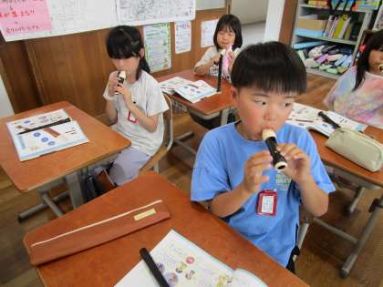 リコーダーの学習が始まりました。1回目の学習では、名称を覚えたり、タンギングを紙を使って確かめたりしました。