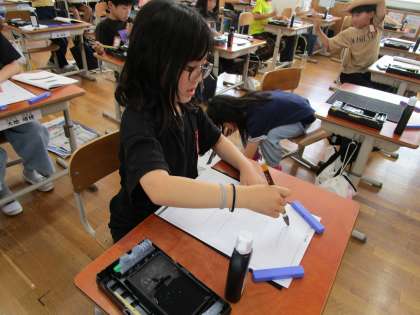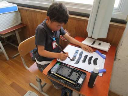 横画の筆使いに気を付けて「二」を書きました。正しい姿勢も意識して書くことができました。