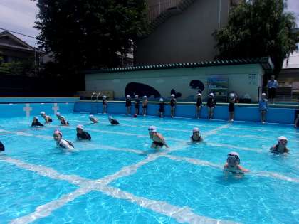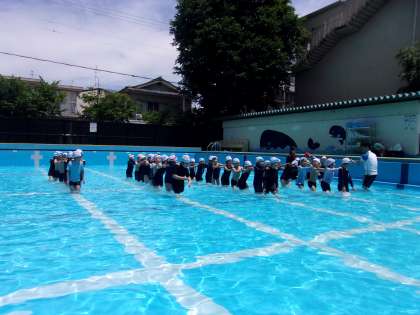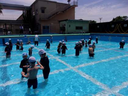 ほかにも、プールの中で列車を作ったり、たから探しをしたりしました。天気も良く、とても楽しそうな一年生でした。