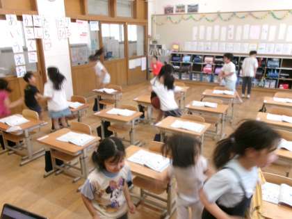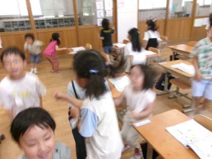 「しろくまのジェンカ」の曲に合わせて、「タンウンタンウンタンタンタンウン」のリズム打ちを楽しんでいます。リズムに慣れると、このリズムに合わせて、ジェンカを踊ることができました。