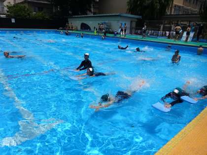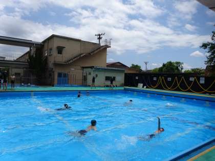 5年生になって初めての水泳学習です。水慣れで浮く練習をしたり、今できる泳ぎ方で距離に挑戦したりしています。