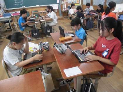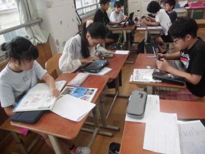 授業では、SDGsの取組について班ごとに調べています。