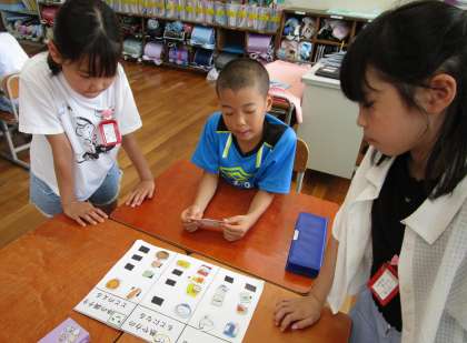 栄養教諭の先生に食べ物のはたらきについて教えてもらいました。ペープサートで栄養素について楽しく学習した後に、今日の給食の食材を色分けしてみました。