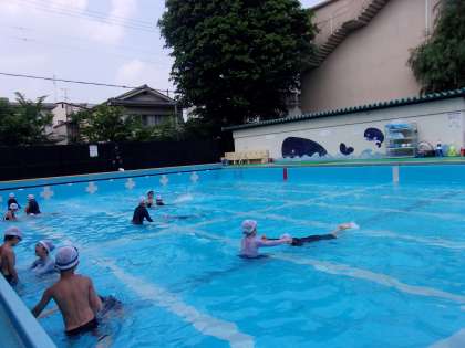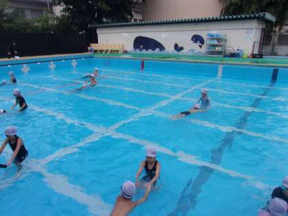 今日の水遊びでは、もぐる・うく遊びのほかに、「ふしうき」「ひきふね」をしました。