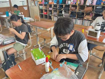 授業では、クランクの動きをいかした作品づくりをしています。